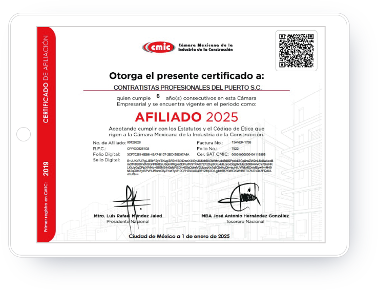 Contratistas Profesionales del Puerto, S.C. Afiliación CMIC La Cámara Mexicana de la Industria de la Construcción es el máximo órgano de representación del gremio, consolida, unifica y promueve desde 1953 a las empresas afiliadas del país .